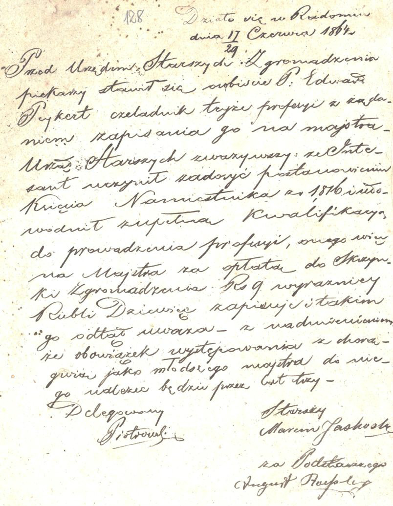 Zapis na majstra profesji piekarskiej dla Edwarda Pajkerta, Radom 1864 r.