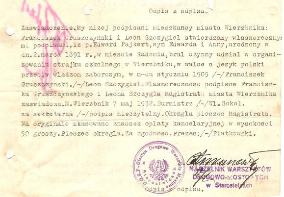 Odpis potwierdzenia udziału Edwarda Pajkerta w strajku szkolnym