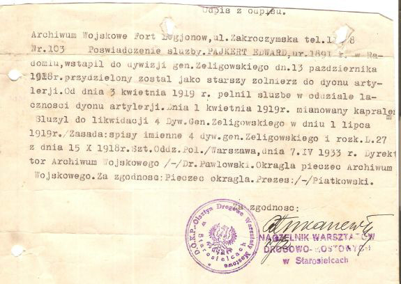 Odpis potwierdzenia służby wojskowej Edwarda Pajkerta w dywizji gen. Żeligowskiego