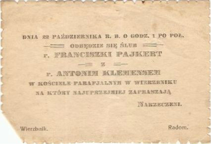 Zaproszenie na ślub Franciszki Pajkert i Antoniego Klemensa